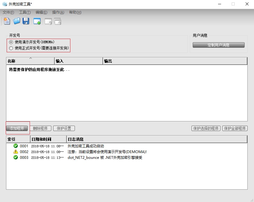 2、直接將被加密文件拖拽至加密框,或者從“添加文件”中選擇被加密的文件。左上角選擇演示開發號或正式開發號。