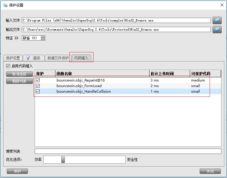 將被加密程序和map文件放同一目錄,加密時在“代碼植入”選項中選擇可以支持在加密狗中運行的代碼。該部分代碼在加密后不會直接在電腦中運行,而是通過加密狗運行并向程序返回運行結果。哪些代碼可以在加密狗中運行由加密工具自動判斷,函數代碼太短可能無法被加密工具識別,太長可能會影響運行效率,具體根據實際程序代碼情況需要多次測試。使用代碼植入功能需要包含map文件,點擊此處查看如何生成map文件->>>>>>>