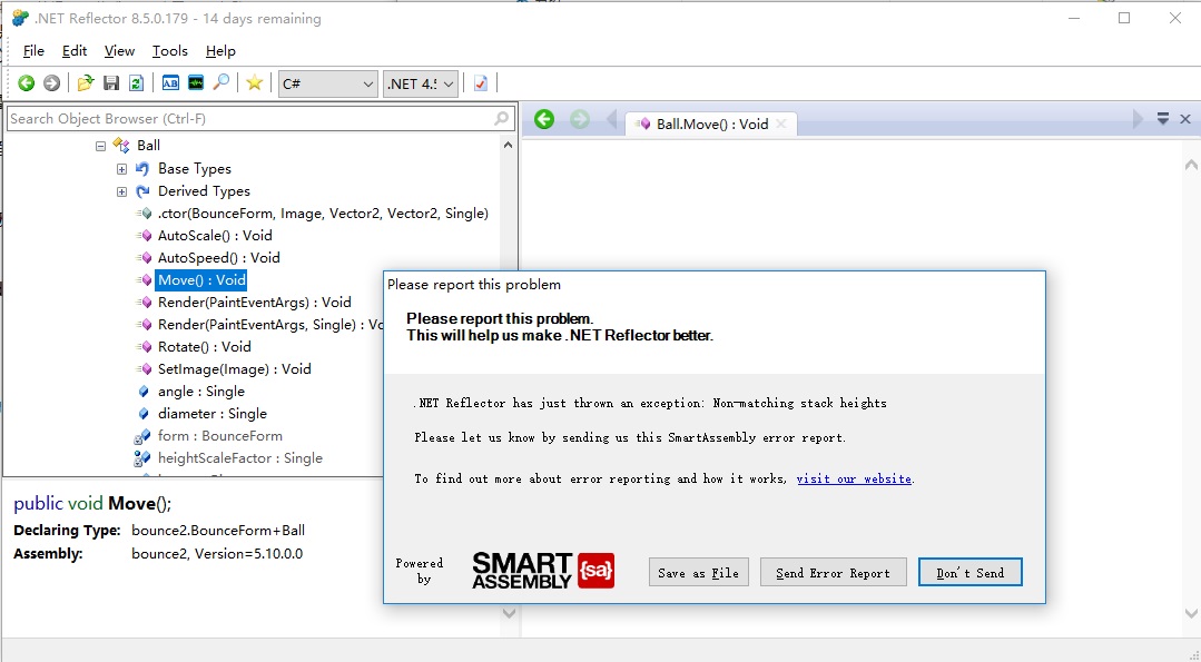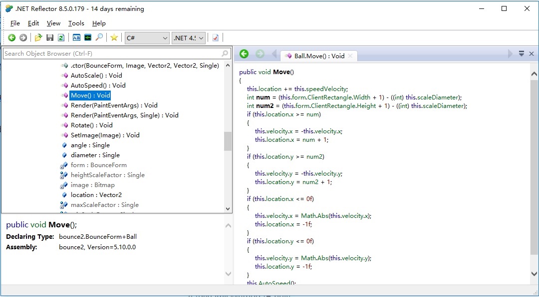 把dot_NET2_bounce.exe拖進反編譯工具.NET Reflector 8.5,可以清楚地看到move()方法的代碼。