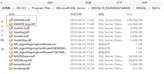 2、 把之前備份的emsdb.mdf和emsdb_log.ldf復制到C:\Program Files\Microsoft SQL Server\MSSQL10_50.EMSDATABASE\MSSQL\DATA目錄