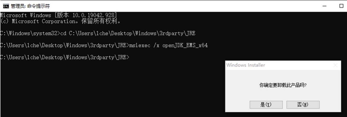 以管理員權限打開 cmd.exe,進入到 LDK 8.2 安裝包的 \Windows\3rdparty\JRE 路徑下,輸入命令 msiexec /uninstall openJDK_EMS_x64 或 msiexec /x openJDK_EMS_x64。