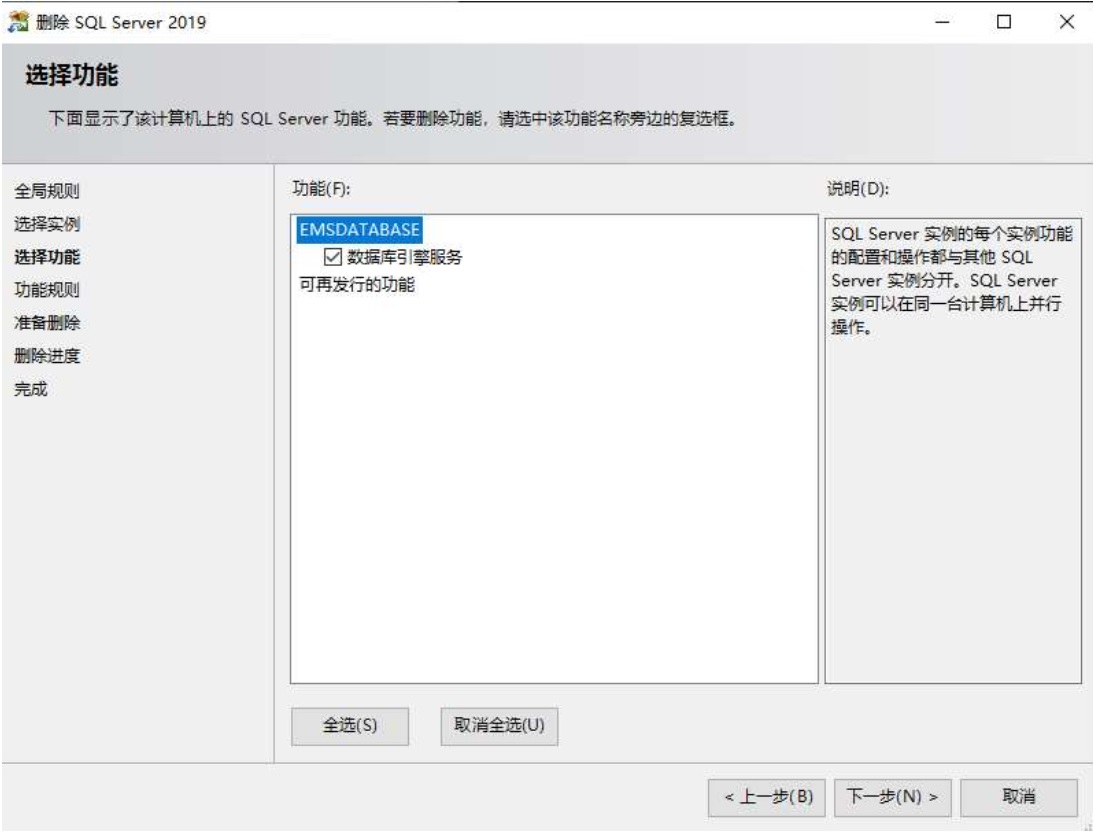 從控制面板卸載 “Microsoft SQL Server 2019 (64bit)”,卸載時打勾 EMSDATABASE 的 “數據庫引擎服務”。