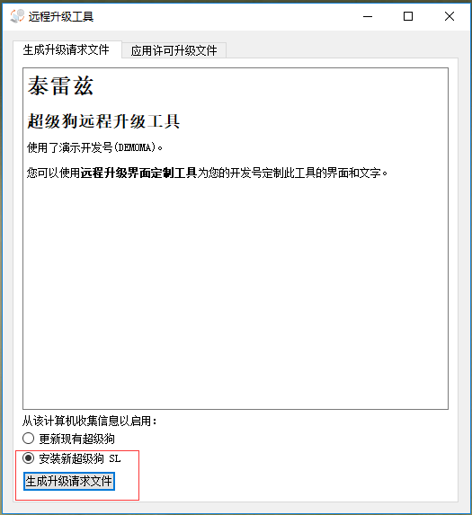 選擇【安裝新超級狗SL】,并點(diǎn)擊【生成升級請示文件】,將會生成一個擴(kuò)展名為“c2v”的文件,將此文件發(fā)送給軟件開發(fā)商。